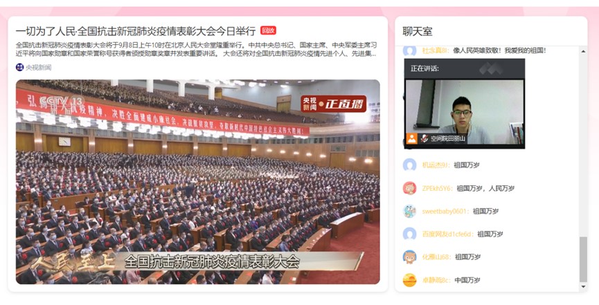 9月8日早上10点全国抗击新冠肺炎疫情表彰大会在北京人民大会堂隆重举行。中共中央总书记、国家主席、中央军委主席习近平向国家勋章和国家荣誉称号获得者颁授勋章奖章并发表重要讲话。太阳成集团tyc7111cc组织研究生党支部就此学习习近平讲话精神并进行线上讨论。