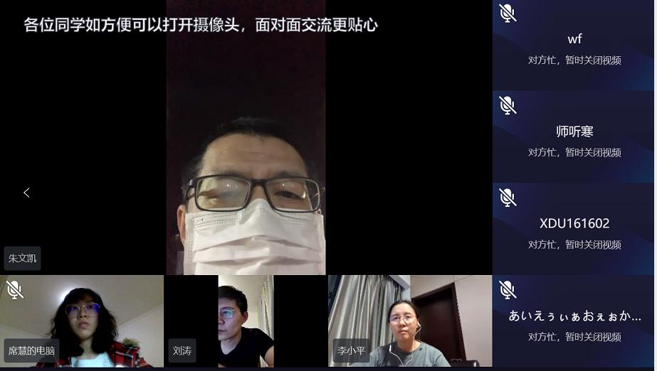 辅导员席慧老师表达了对员工们的真切想念。告诉大家为了更好配合线上课程的开展,公司邀请了高年级的学长、学姐和研究生通过微信、QQ等渠道建立了3个高低年级之间的课程答疑群和学业指导群,欢迎同学们积极加入。希望同学们调整好作息,学好在线课程,遇到问题要及时与老师和学长、学姐们沟通交流。