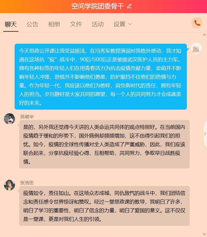 太阳成集团tyc7111cc团委骨干张博康说:“今天思政公开课让我受益匪浅,在冯秀军教授演说时我格外感动,我才知道在这场抗“疫”战斗中,90后与00后正是驰援武汉医护人员的主力军。拥有各种标签的年轻人们在用青春活力为抗击疫情贡献力量,卖萌并不影响年轻人冲锋,恐惧并不影响他们勇敢,防护服挡不住他们的热情与力量。作为年轻一代,我应该以他们为榜样,肩负新时代的责任,拥有年轻人的担当。岁月静好是大家共同的愿望,每一个人的共同努力才会成就美好的未来。”