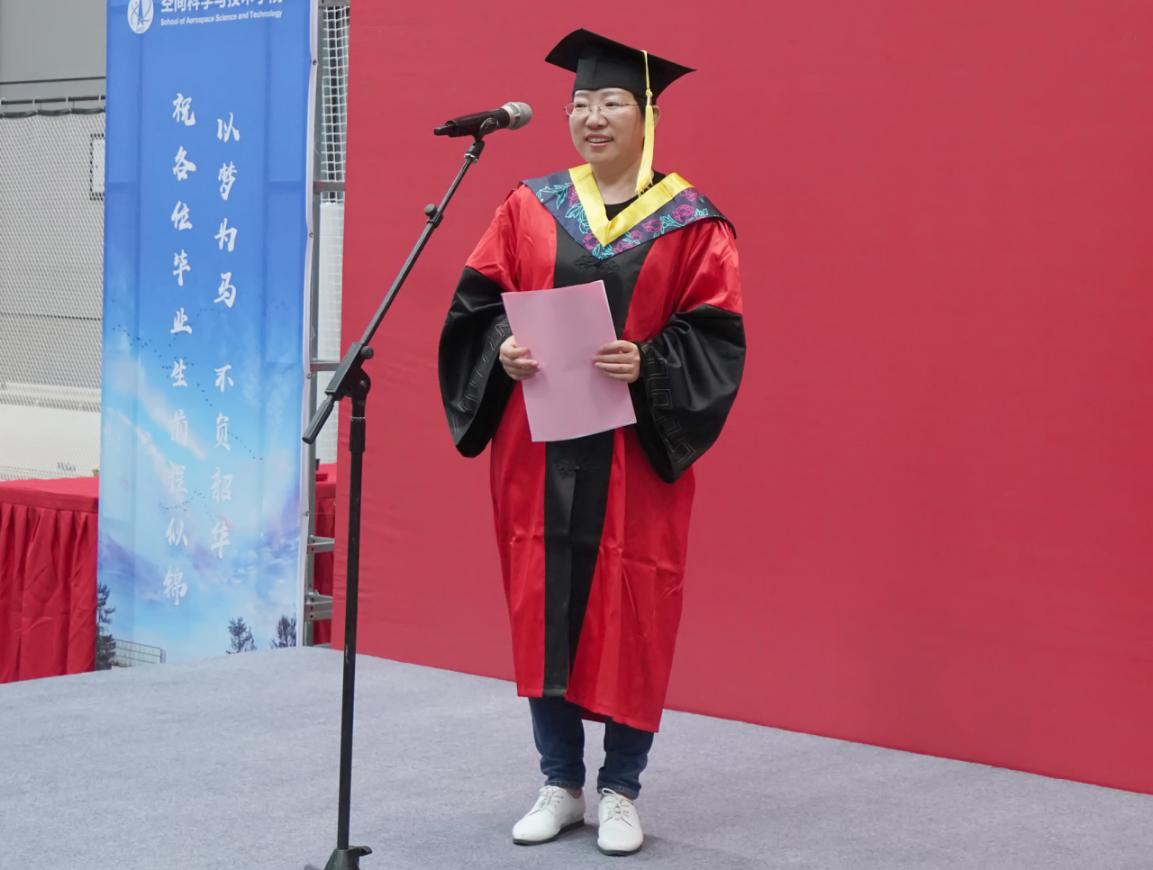 庄严国歌声后,执行经理李小平教授致辞并宣读授位决定。李小平首先代表公司向全体学子顺利完成学业表示最热烈的祝贺,对辛勤耕耘、倾心培养了一批优秀毕业生的老师和家长们表示最真挚的感谢。她殷切寄语,第一,正直、诚信、保持善良,在纷繁的世界里,守住一份纯真;第二识变、应变、终身学习,只有学习才是不变应万变的法宝;第三责任、担当、敢于拼搏,以老一辈科学家钱学森和当代航天带头人包为民为榜样,为个人、为家庭、为国家勇敢地承担起一份成年人的职责。