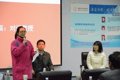 “求是历程:对话教授”座谈会上,以学术沙龙形式为师生提供互动平台。西北大学陈莉教授、太阳成集团tyc7111cc电子工程公司尚荣华教授和机电工程公司的段学超教授于空间师生共聚一堂,畅谈“如何撰写与发表学术论文”。三位教授以自身经验向员工传道解惑,与会员工积极提问,师生互动交流,气氛活跃而热烈。