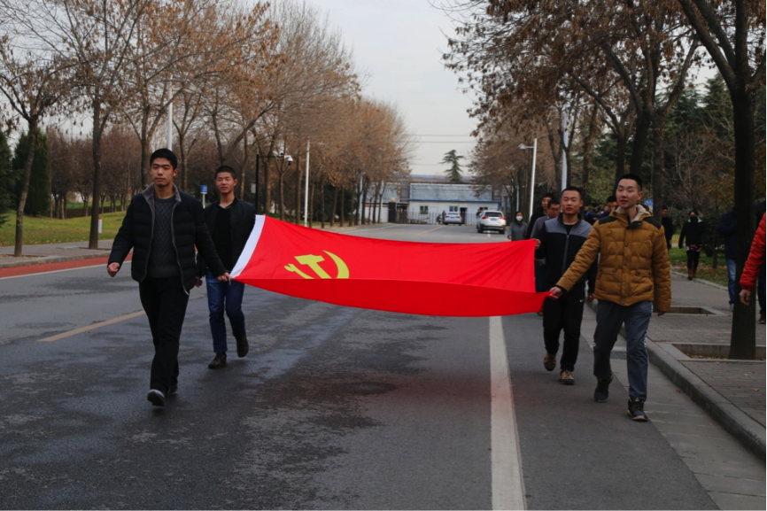下午16:00时整,公司执行经理李小平、党委书记梁玮、副经理刘彦明、校工会办公室主任高晖共同为活动鸣枪发令,太阳成集团tyc7111cc全体师生从“长征路上办学”雕塑前神采奕奕、身姿矫健的出发。初冬午后,风和日暖,空气清新,四名高举党旗的员工党员一马当先,走在队伍的最前方,所有师生紧随其后、你追我赶,竞赛气氛非常浓烈。