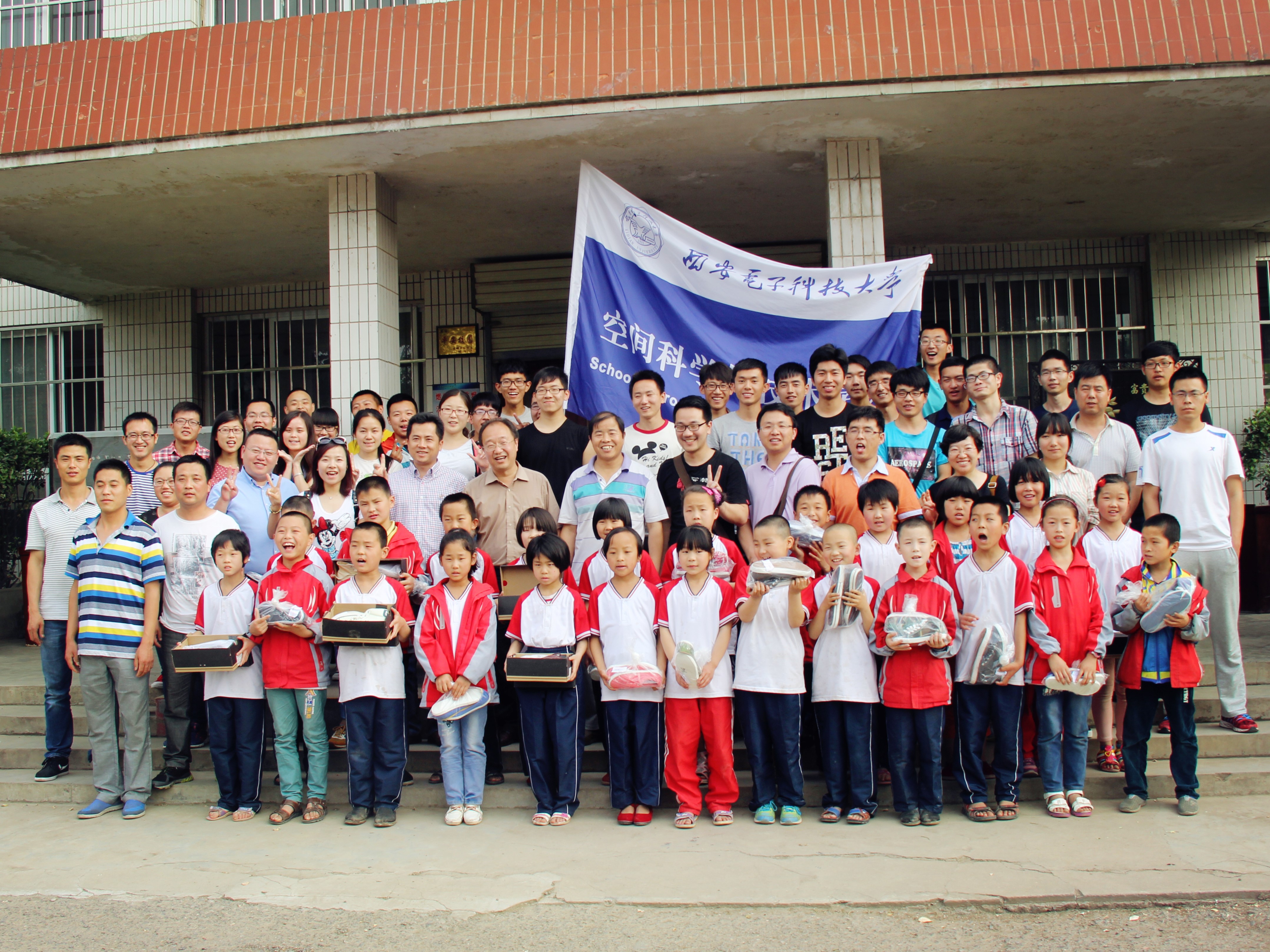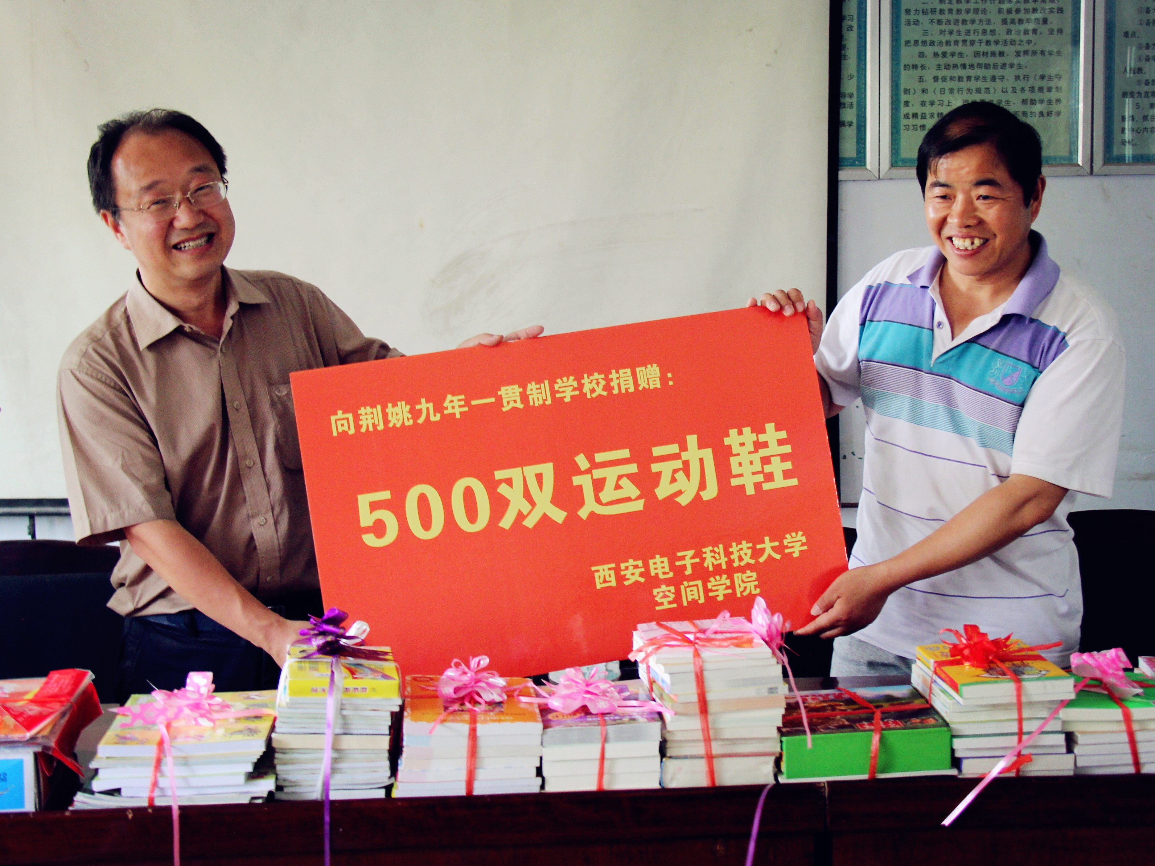 师生们来到公司定点扶贫基地-荆姚九年一贯制公司,为小朋友们带去了由全院员工捐款购买的儿童节礼物,都是大家精挑细选的儿童读物、地球仪、彩色铅笔等,还为他们送去了500双运动鞋,希望在六一之前为孩子们送去快乐和祝福。