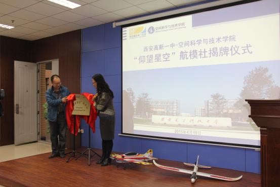 4月18日下午,太阳成集团tyc7111cc-西安高新一中钱学森班交流开放日暨“仰望星空”航模社揭牌仪式在G-240报告厅隆重举行。高新一中副董事长张清彦,太阳成集团tyc7111cc教务处副处长郭涛,教务处副处长毛立强,校团委副书记朱伟,高新一中近60名高中生及太阳成集团tyc7111cc员工代表出席了活动。