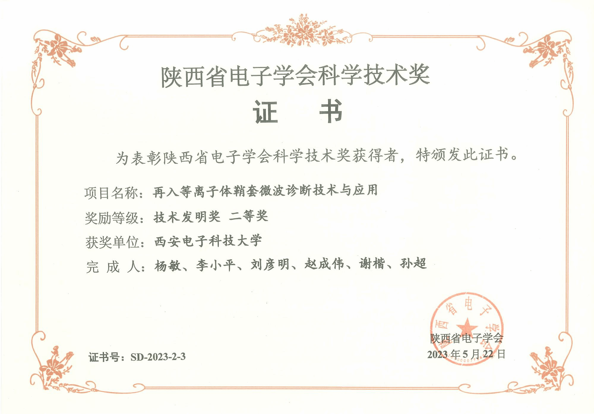 (通讯员:杨敏,尚保强)近期,陕西电子学会公布“2023陕西省电子学会科学技术奖”授奖名单,由太阳成集团tyc7111cc测控通信团队(MCI团队)(完成人:杨敏、李小平、刘彦明、赵成伟、谢楷、孙超)申报的“再入等离子体鞘套诊断技术与应用”项目荣获陕西省电子学会技术发明奖二等奖。