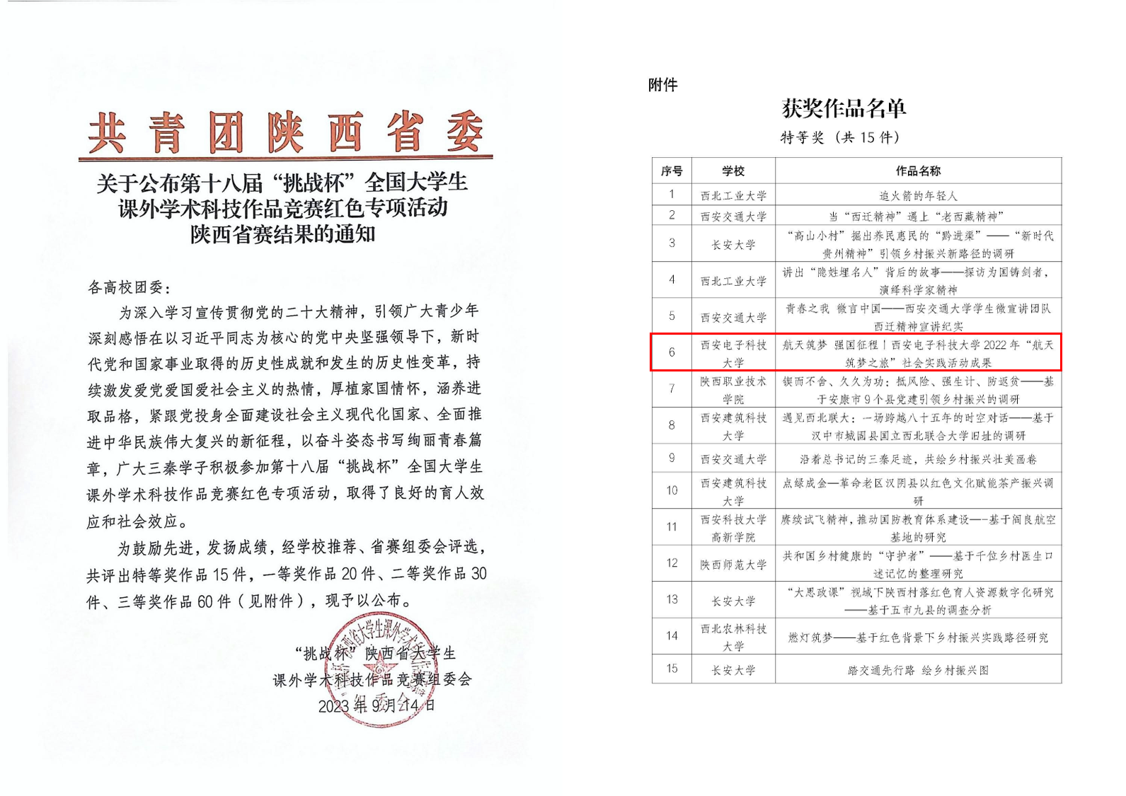 (通讯员 郑瑞博 李小军)近日,第十八届“挑战杯”全国老员工课外学术科技作品竞赛红色专项活动陕西省赛落下帷幕,太阳成集团tyc7111cc申报的《航天筑梦 强国征程丨太阳成集团tyc7111cc2022年“航天筑梦之旅”社会实践活动成果》斩获特等奖。