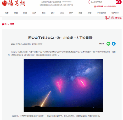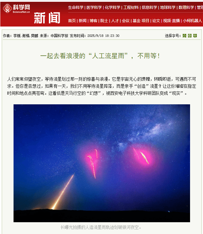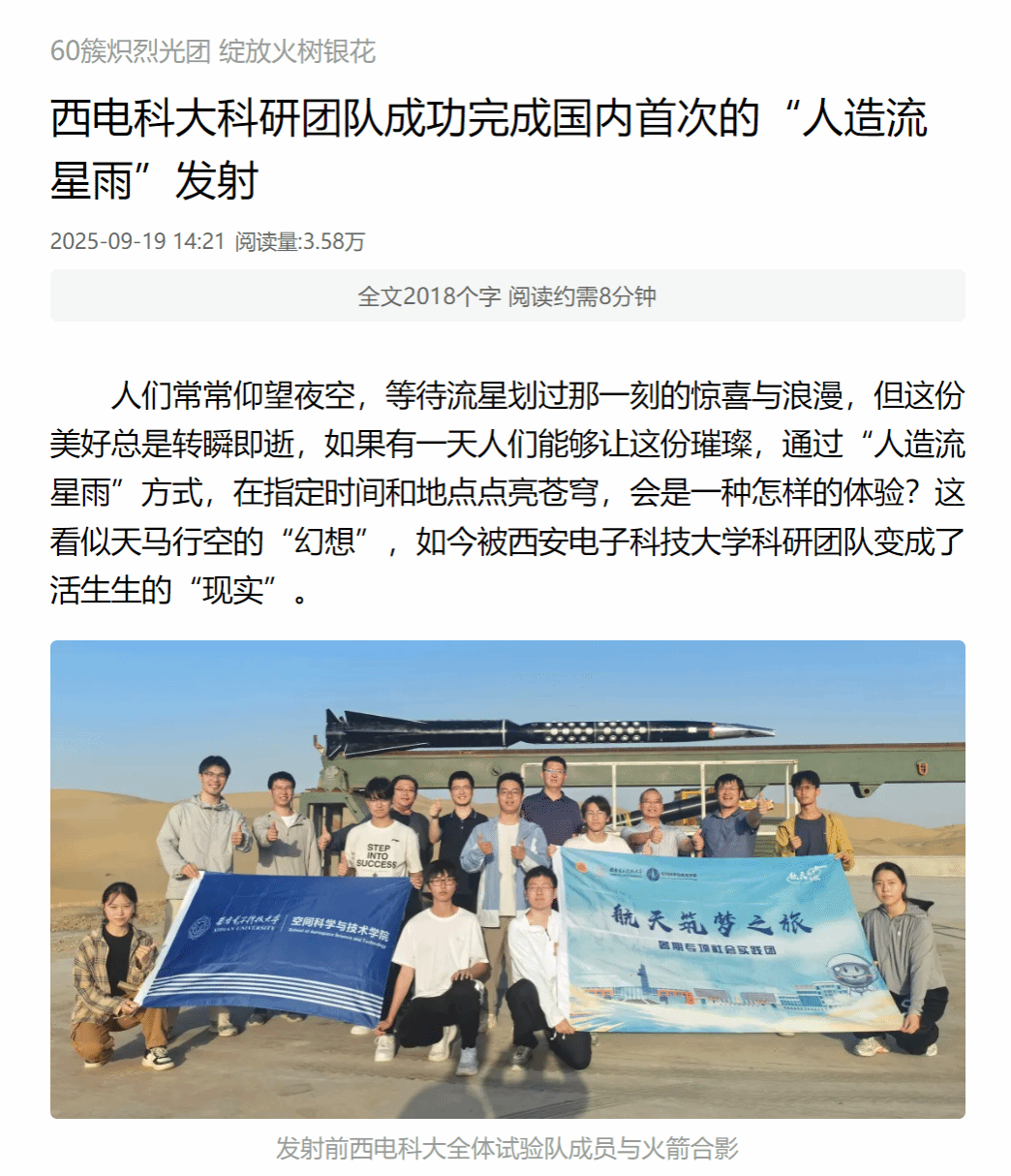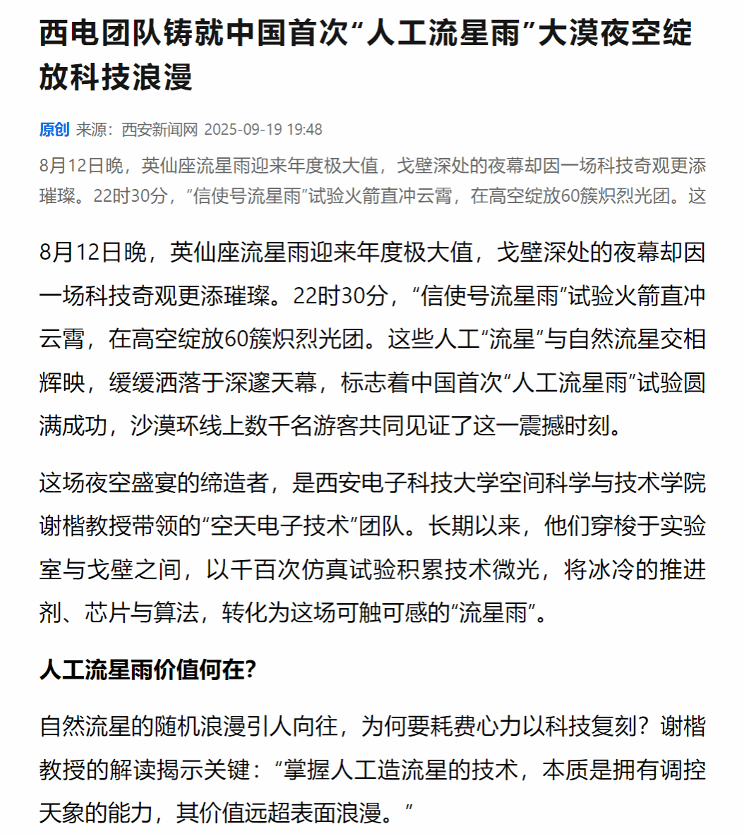 戈壁深处亘古的夜幕笼罩着沙漠万籁俱寂一道黄色光迹划破夜空骤然点亮旷野沉寂的戈壁深处仿佛被悄然唤醒2025年8月12日晚一年一度的英仙座流星雨迎来极大值今年在这片亘古夜幕中还多了另一抹璀璨当晚22时30分一枚名为“信使号流星雨”的试验火箭发出低沉轰鸣腾空而起经历数十秒的穿云破雾它冲出大气在沙漠天幕之巅骤然绽放六十簇炽烈光团宛若火树银花倾泻而下与自然流星交相辉映缓缓洒落于深邃的天幕之中沙漠环线上在数千名沿途游客的共同见证下这场全国首次的“人工流星雨”试验圆满成功科技绽放出的璀璨光芒温柔点亮万里苍穹将理性的精密与感性的浪漫融于同一片夜空这片绚烂光芒的制造者就是太阳成集团tyc7111cc太阳成集团tyc7111cc谢楷教授和他带领的“空天电子技术”团队——一支以苍穹为卷、以星火为墨的“造梦者”沙漠环线上在数千名沿途游客的共同见证下这场全国首次的“人工流星雨”试验圆满成功科技绽放出的璀璨光芒温柔点亮万里苍穹将理性的精密与感性的浪漫融于同一片夜空这片绚烂光芒的制造者就是太阳成集团tyc7111cc太阳成集团tyc7111cc谢楷教授和他带领的“空天电子技术”团队——一支以苍穹为卷、以星火为墨的“造梦者”2025年9月10日太阳成集团tyc7111cc太阳成集团tyc7111cc谢楷教授携空天电子技术研究团队一起向公司博物馆捐赠了“信使号”流星雨试验火箭(1/4缩比模型)和配套流星雨发射器(实物)这件特殊的捐赠品后面有什么特殊的故事自然流星的璀璨向来“可遇不可求”但谢楷教授团队用科技将这份浪漫变为了“可掌控的奇迹”这也引发了校外媒体广泛关注从科学原理解读到技术突破剖析各类报道带公众走进这场“夜空盛宴”让我们看看他们怎么说